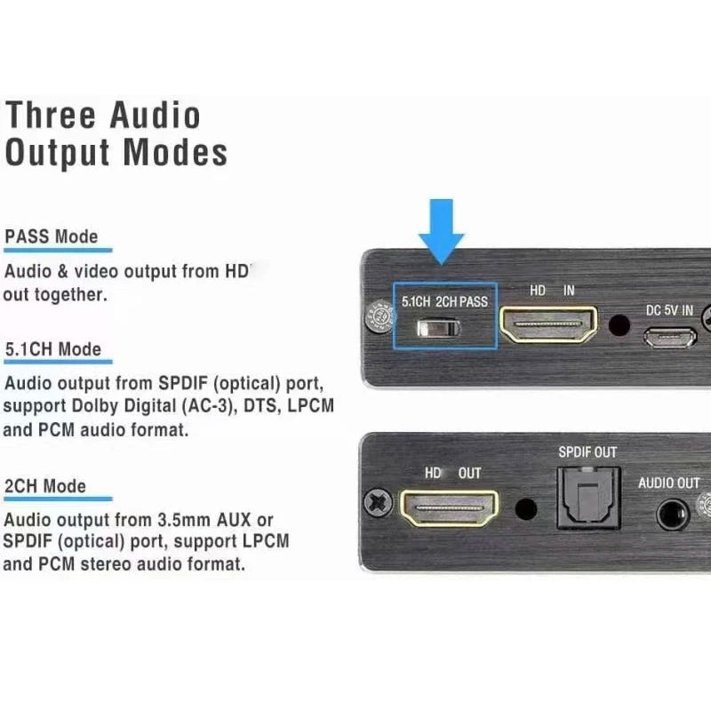 - 5.1CH Mode: Extract 5.1 Dolby Digital/DTS and output via HDMI-compatible/SPDIF.