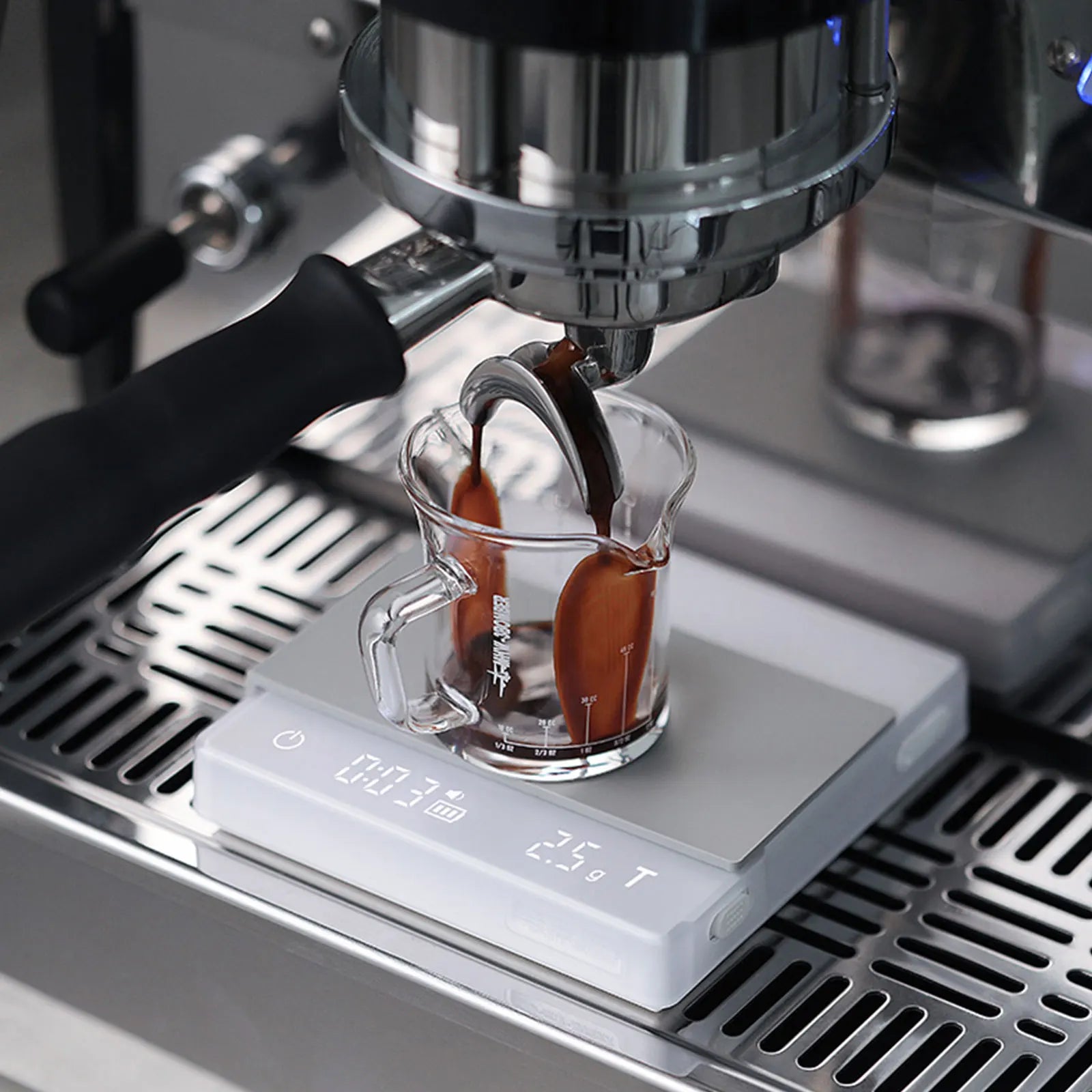 With a maximum capacity of 2000g, this scale is perfect for measuring larger quantities of coffee beans or grounds. It also has a timer function, allowing you to track the brewing time for a more precise and consistent cup of coffee. The scale is powered by two AAA batteries, making it portable and easy to use anywhere.