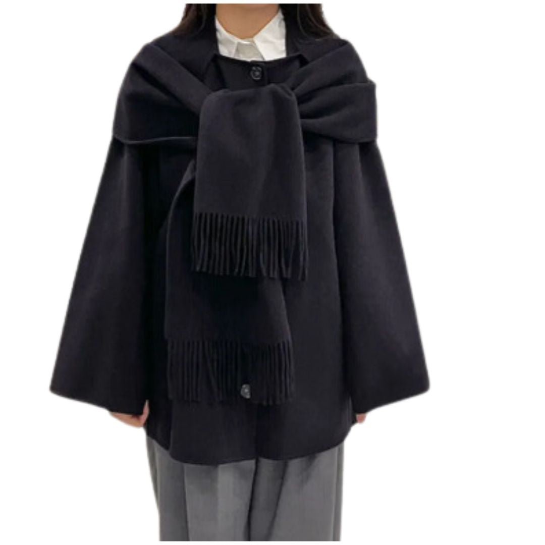 Introducing Oversized Scarf Coat – a winter essential that effortlessly blends fashion and functionality. Crafted from a premium double-faced wool blend and polyester, this coat ensures unmatched warmth and quality for chilly days. Its unique design features dropped shoulders, wide sleeves, and a discreet button closure, creating a relaxed yet sophisticated silhouette. What sets this coat apart is the built-in, blanket-style fringed scarf, adding both warmth and chic charm to your outfit. Whether you're looking for an oversized wool-blend scarf jacket or a navy coat with style, Oversized Scarf Coat has you covered. Ideal for those who appreciate the convenience of a coat with a scarf, it combines the warmth of a wool jacket with scarf-like comfort. Upgrade your winter wardrobe with this remarkable piece – a perfect union of fashion and comfort. Don't miss out on the oversized coat with a scarf – make it yours now.